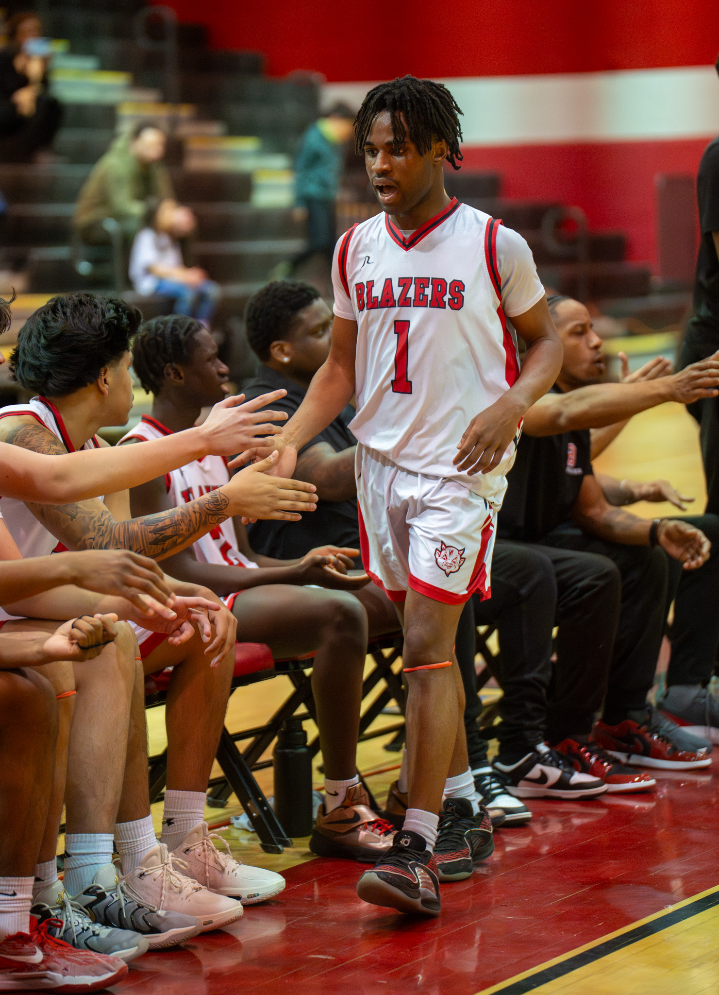 Senior Elom Amenti high fives players after checking out of the game