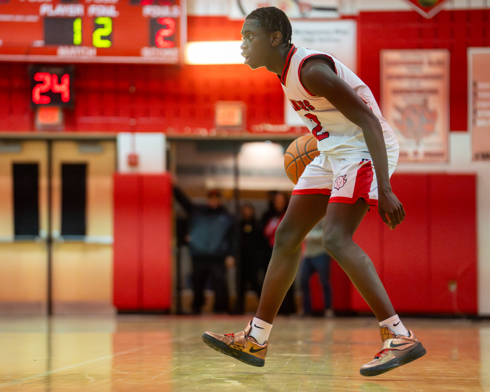 Senior Bakarr "BK" Abu scans the court while gracefully dribbling