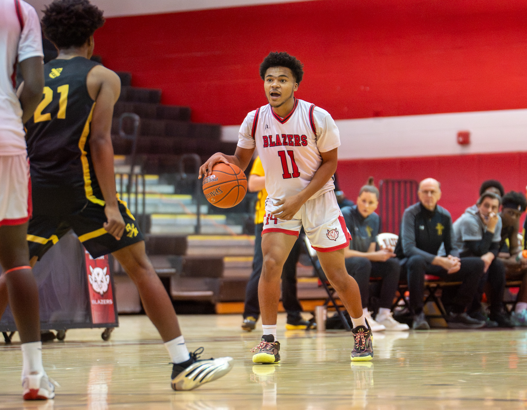 Photo: Senior Bakarr "BK" Abu scans the court while gracefully dribbling