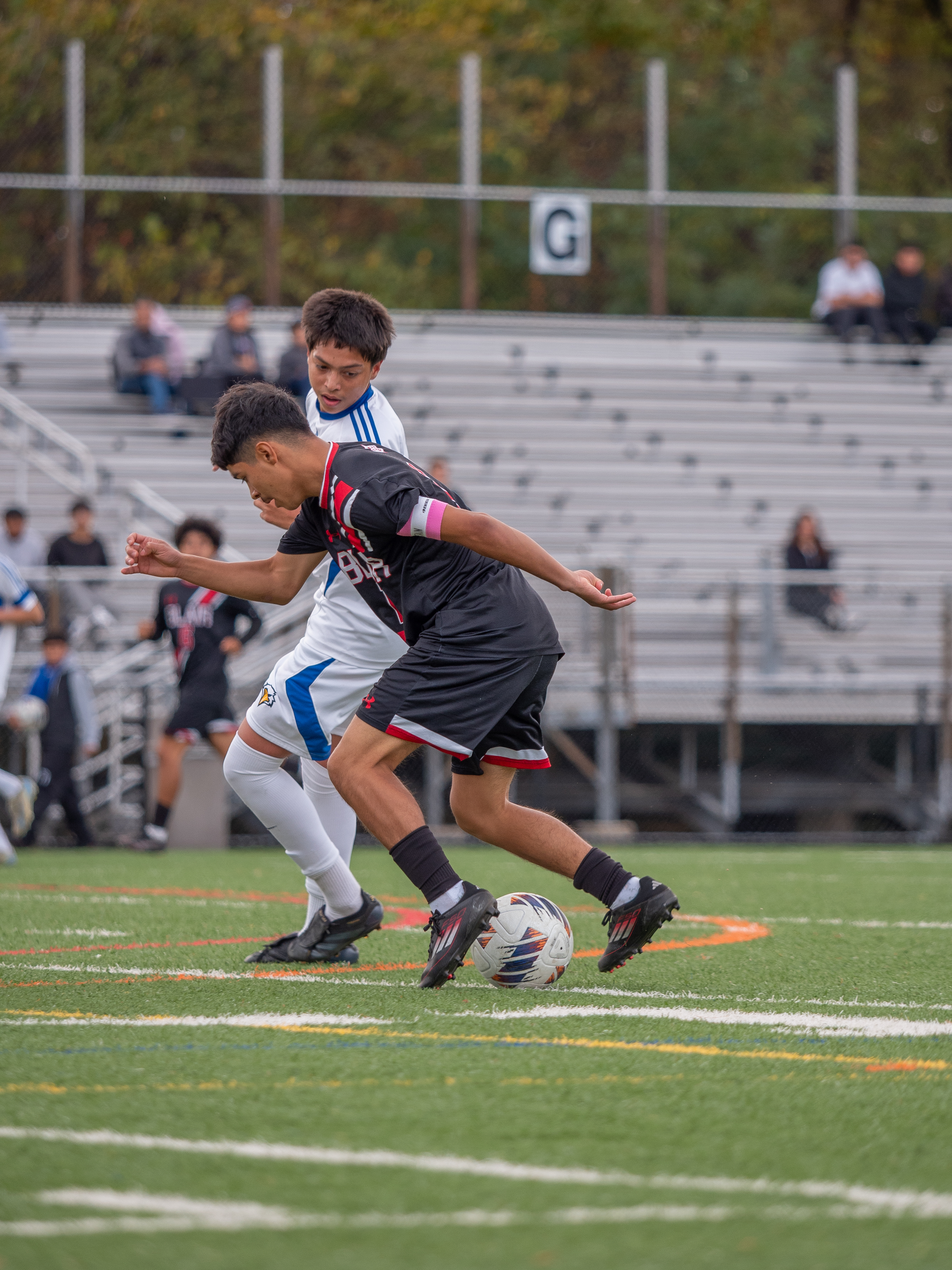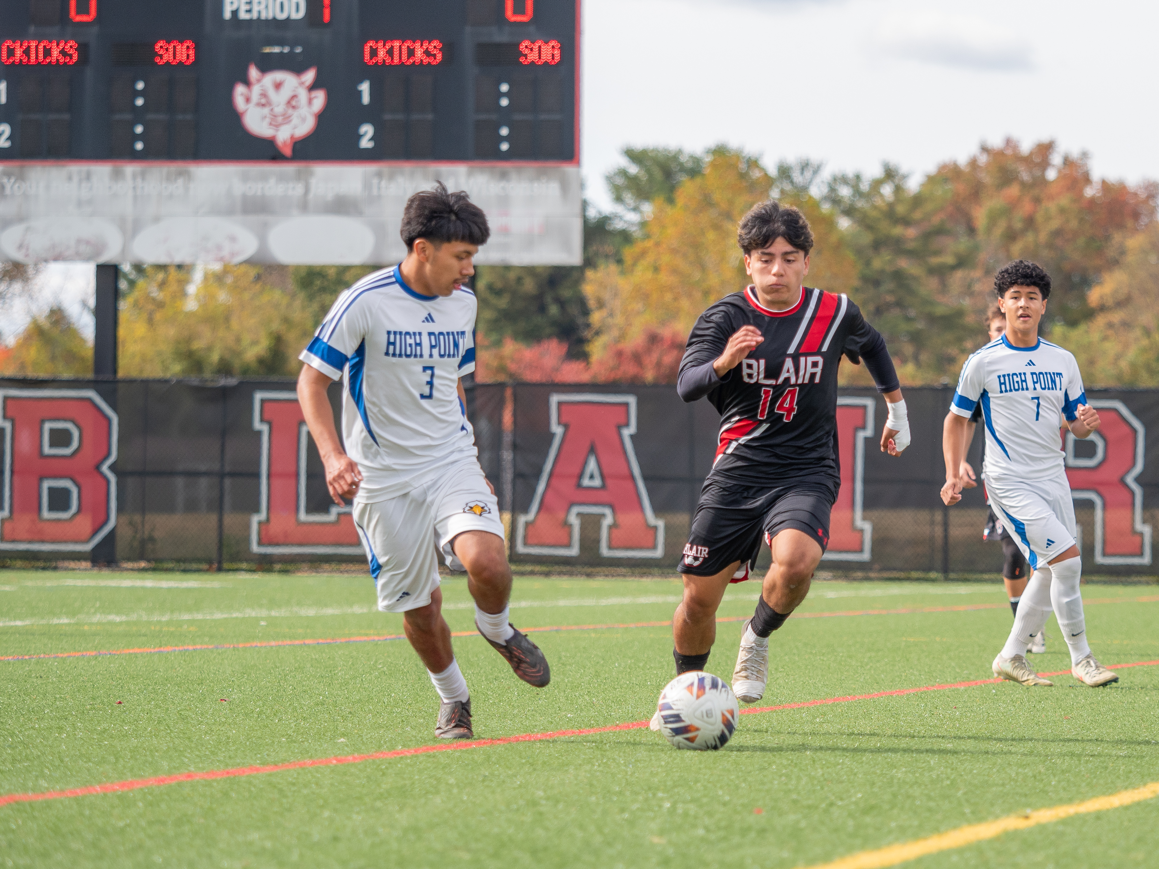 Photo: Blair’s #14 Oscar Pinto (Grade 11) racing to the ball against a High Point defender