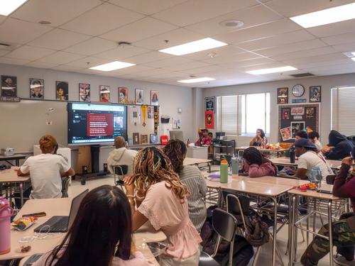 Students and staff gather to listen to the rapper's newest album