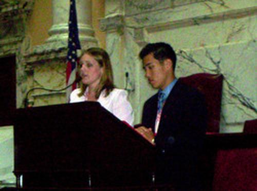 Youth and Government delegates Marcie Wells and Blair senior Phuson Hulamm speak in the Senate debating their bill legalizing euthanasia in the state of Maryland.