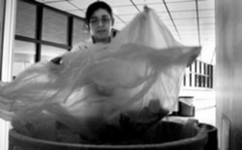 Building services worker Marisol Cortez cleans up trash after school. She is currently working to graduate from Montgomery College.