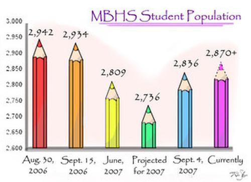 Class sizes have remained the same despite a drop in the overall student population. Student enrollment for the 2007-2008 school year was higher than projected, according to assistant principal Myriam Rogers, causing large class sizes to remain a problem at Blair.